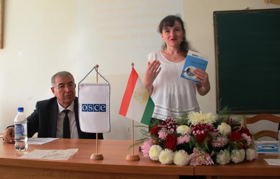 Махмадулло Давлатов, психолог, национальный эксперт по вопросам реабилитации жертв насилия в семье (слева) и Виорелия Русу, сотрудник по гендерным вопросам и противодействию торговле людьми Бюро ОБСЕ в Таджикистане (справа) во время презентации практического пособия по реабилитации пострадавших от домашнего насилия, Душанбе, 21 сентября 2016.
