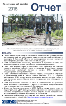 В отчете представлен обзор Специальной Мониторинговой Миссии (СММ) ОБСЕ, последние события и новости по состоянию на 9 сентября 2015.