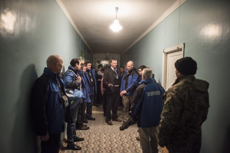 Первый заместитель Главы СММ ОБСЕ Александр Хуг встретился с командой СММ на открытии передовой патрульной базы СММ в Светлодарске, 14 января 2016 года.