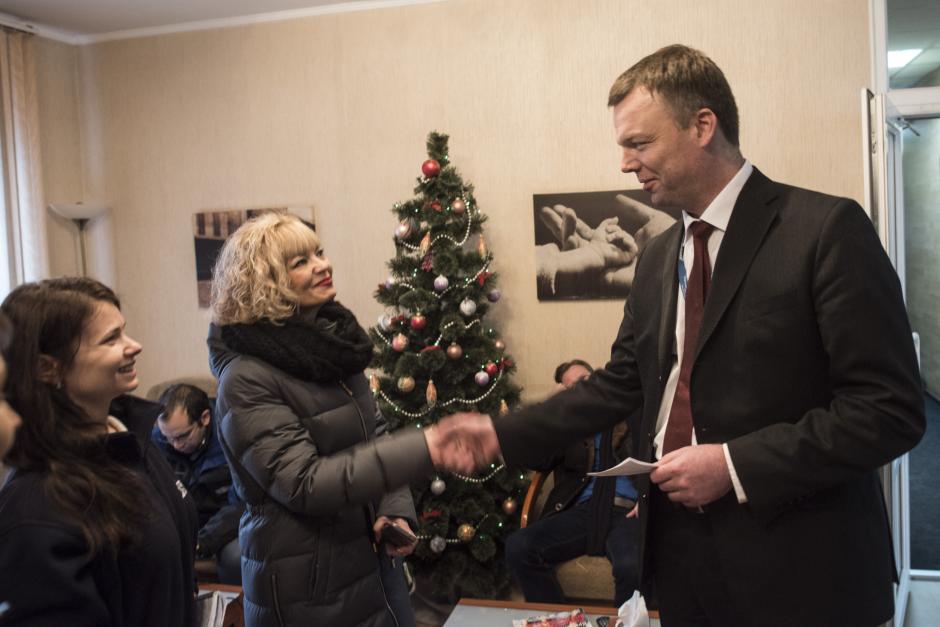 Заместитель Главы Красноармейской райгосадминистрации Татьяна Радченко встречается с Первым заместителем Главы СММ ОБСЕ Александром Хугом, 14 января 2016 года.