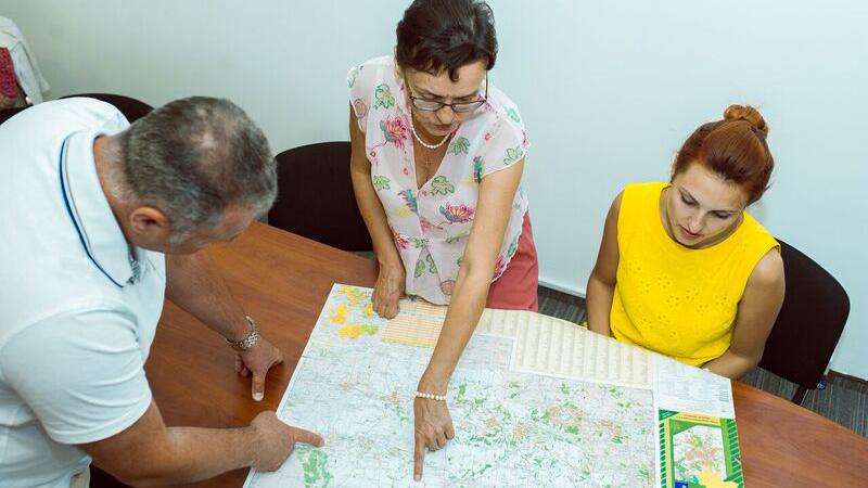 Елена Черенкова (по центру), руководитель местной организации вынужденных переселенцев из Крыма и Донбасса, разрабатывает с коллегами детальный план локального проекта.