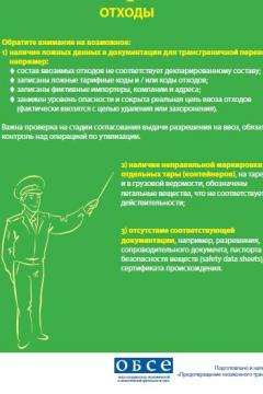 Данный плакат подготовлен с целью обучения персонала, осуществляющего пограничный контроль. Разработка и печать плаката, а также проведение обучений осуществлены при поддержке правительства Финляндии в рамках проекта ENVSEC/ОБСЕ «Предотвращение незаконного трансграничного оборота опасных отходов и других трансграничных экологических правонарушений». Запросы на получение файла в нужном для печати качестве просьба направлять по адресу: Tamara.Kutonova@osce.org.