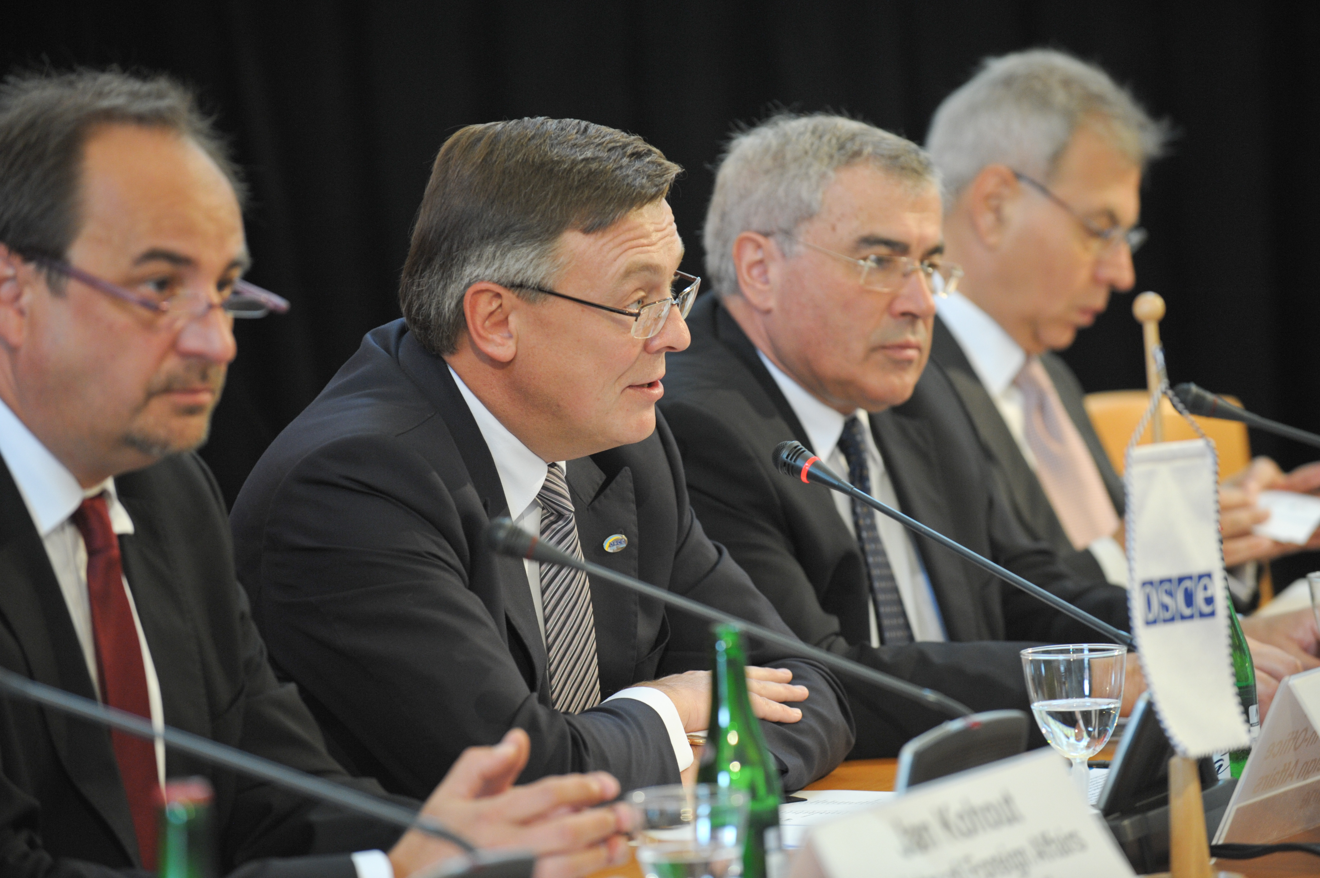 L-r: Jan Kohout, Minister of Foreign Affairs of the Czech Republic; OSCE Chairperson-in-Office, Foreign Minister of Ukraine Leonid Kozhara; and UNECE Executive Secretary Sven Alkalaj; alongside Halil Yurdakul Yigitgüden, Co-ordinator of OSCE Economic and Environmental Activities, at the opening session of the 21st OSCE Economic and Environmental Forum, Prague, 11 September 2013.