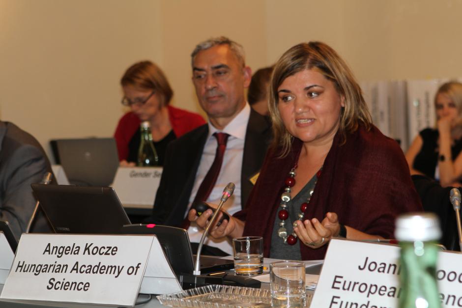 Angela Kóczé addresses the OSCE roundtable discussion “Women as Agents of Change” as Andrzej Mirga, OSCE/ODIHR Senior Adviser on Roma and Sinti Issues, looks on, Vienna, 7 September 2012.