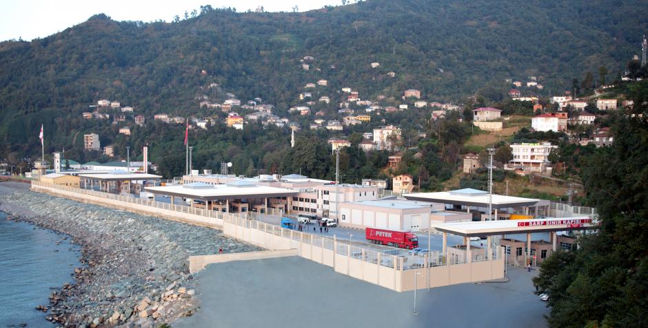Trucks loaded with yarn preparing to enter Georgia from Turkey at the Sarpi/Sarp border crossing point.