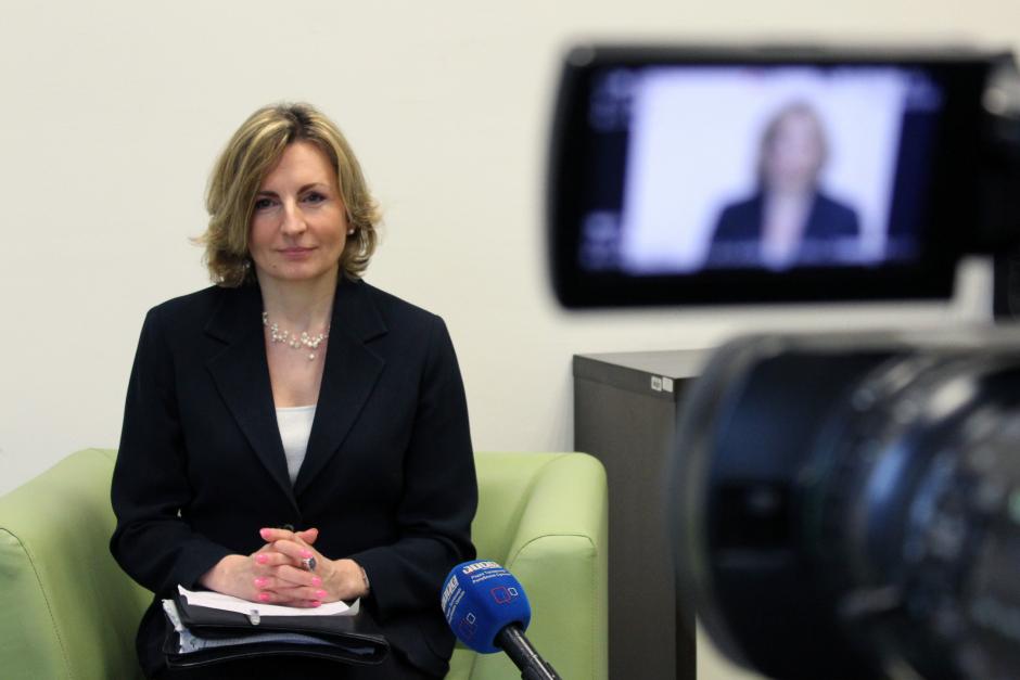 OSCE Co-ordinator for Combating Trafficking in Human Beings, Ruth Freedom Pojman, appears on local television during a visit to Bosnia and Herzegovina, Banja Luka, 6 March 2014.