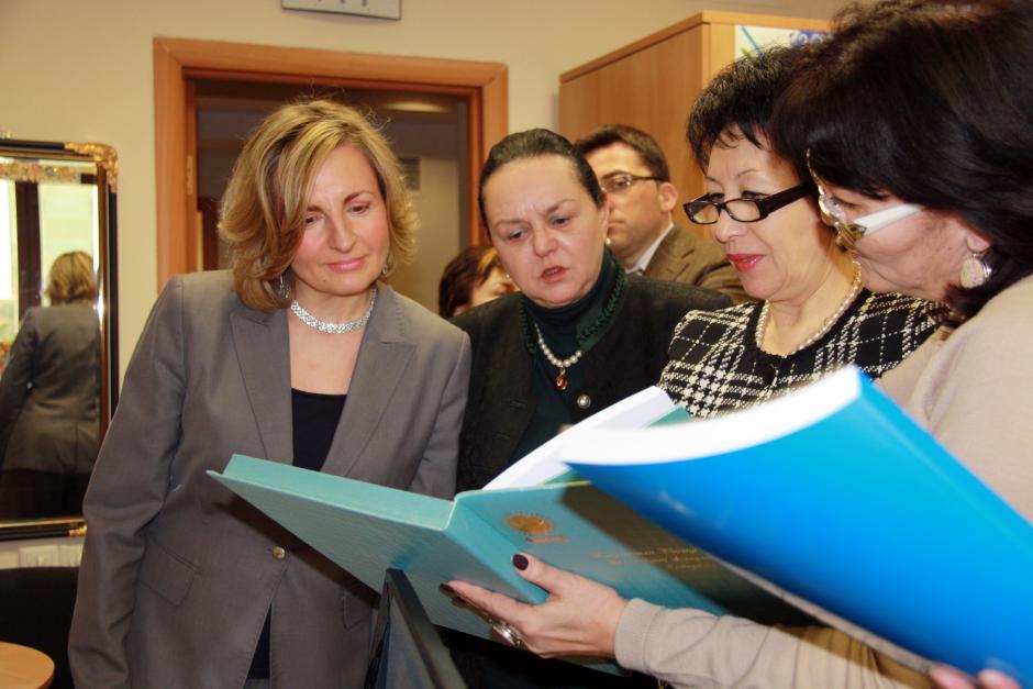 Acting OSCE Co-ordinator for Combating Trafficking in Human Beings, Ruth Freedom Pojman, the Deputy Head of OSCE Centre in Astana, Jeannette Kloetzer and the Chairperson of the Committee on the Protection of Children’s Rights, Raisa Sher, examine official government child protection records during the official visit in Astana,2 April 2014.