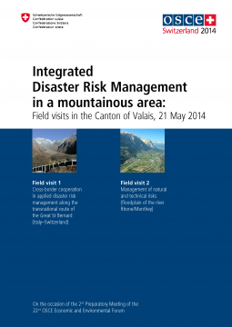 The integrated disaster risk management field visits in the Canton of Valais on 21 May 2014 are organised in conjunction with the 2nd OSCE Preparatory Meeting of the 22nd OSCE Economic and Environmental Forum in Mon-treux, Switzerland. The field visits and its tour guide booklet are a collaboration of the Swiss Confed-eration and the Canton of Valais. The tour booklet incorporates some sections of the brochure that was prepared to accompany the field visits held on 24 May 2013 at the "Global Platform on Disaster Risk Reduction GPDRR”. The booklet first provides a general overview, including a brief presentation of the Swiss context (chapter 2) and the principles of integrated risk management (chapter 3). This is followed by a description of each of the planned field visits (chapters 4 and 5).