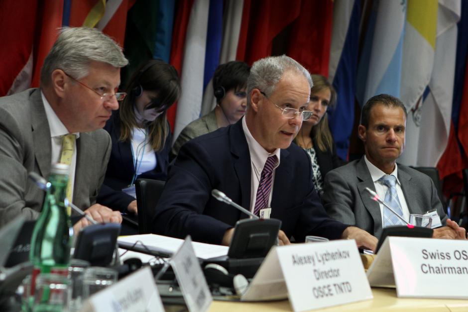 L-r: Alexey Lyzhenkov, Director of the OSCE Transnational Threats Department, Pierre von Arx, representative of the Swiss OSCE Chairmanship, and Olivier Pecorini, Vice-Director and Head of the Main Division
