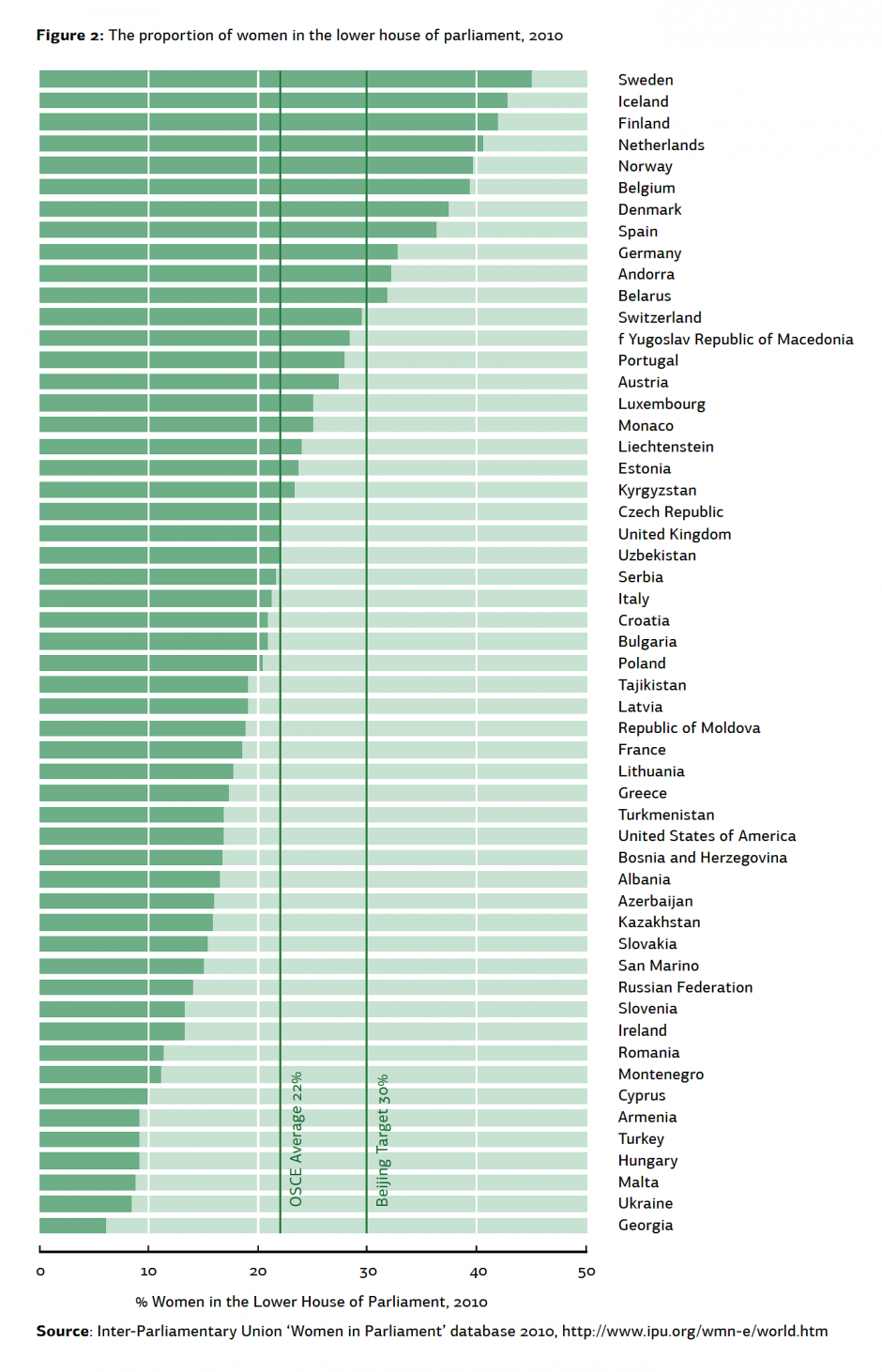 The proportion of women in the lower house of parliament, 2010. Graphic from Gender Equality in Elected Office: A Six-Step Action Plan (http://www.osce.org/odihr/78432).
