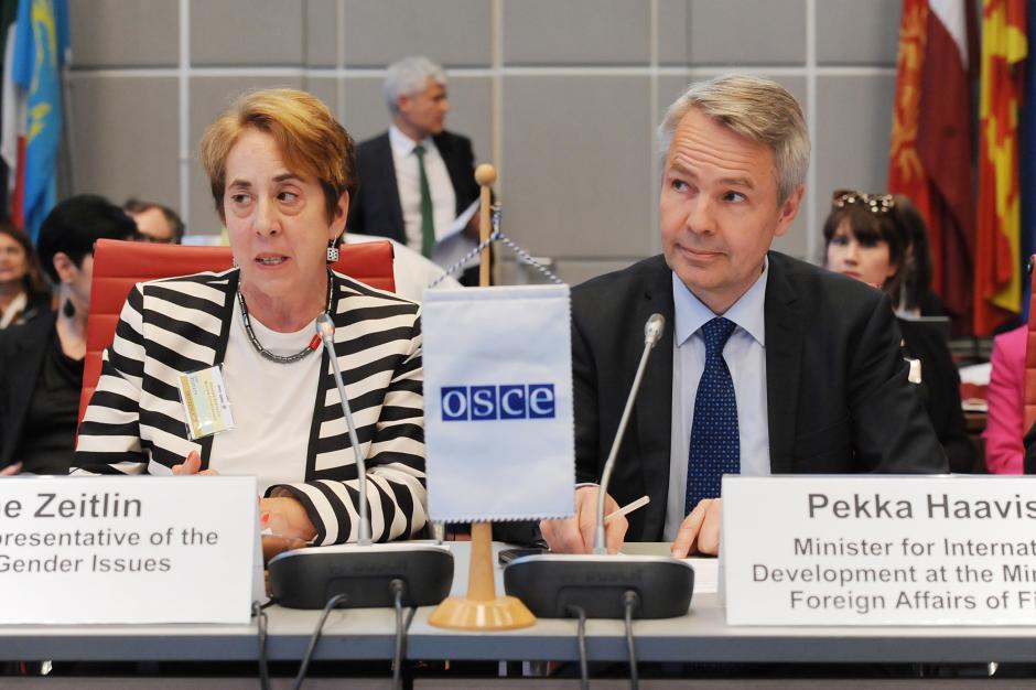 Special Representative of the OSCE Chairperson-in-Office on Gender Issues June Zeitlin, and Pekka Haavisto, the Finnish Minister for International Development, address participants at the opening of the Gender Equality Review Conference, Vienna, 10 July 2014.