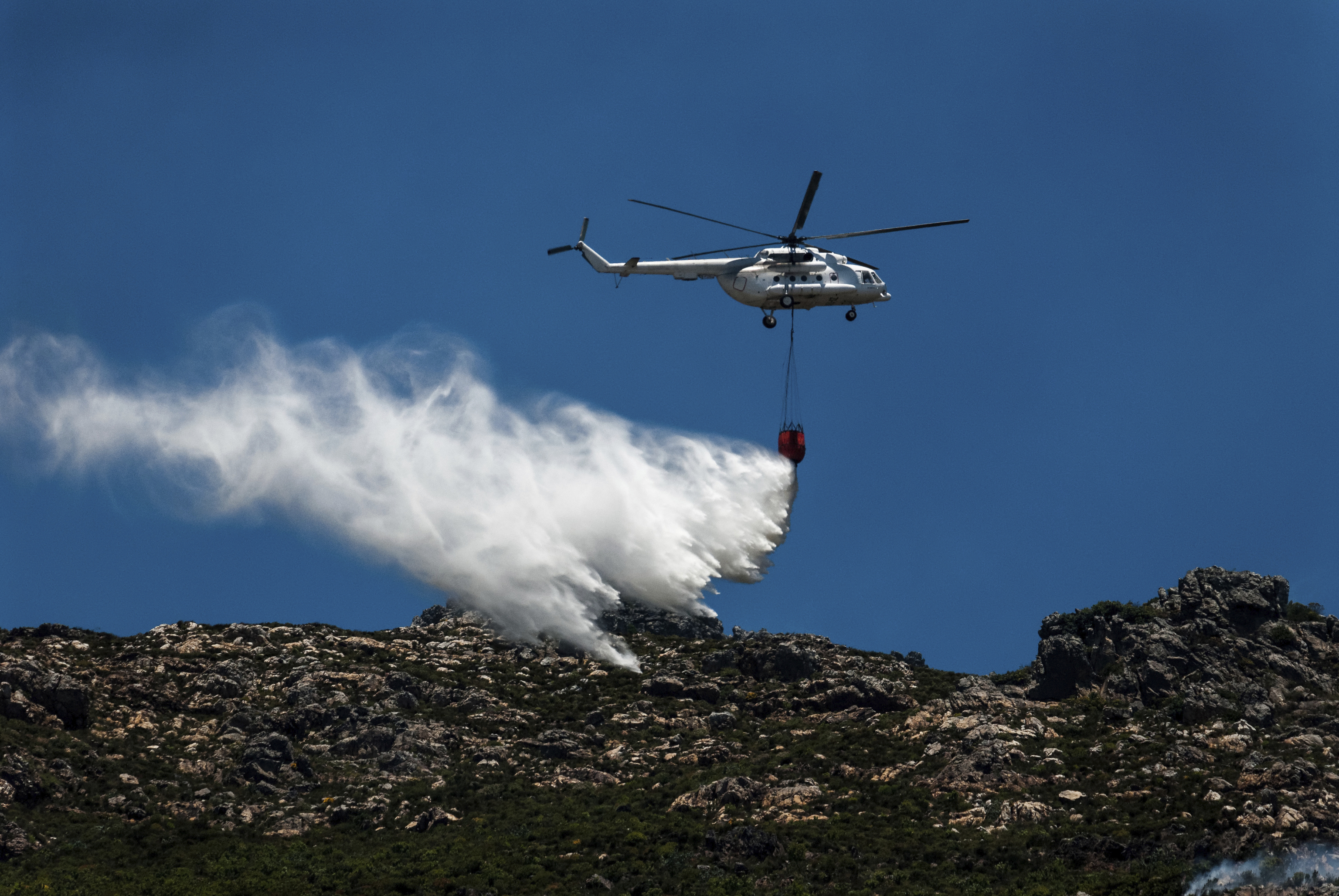 A helicopter sprays water over a forest fire, 2008.