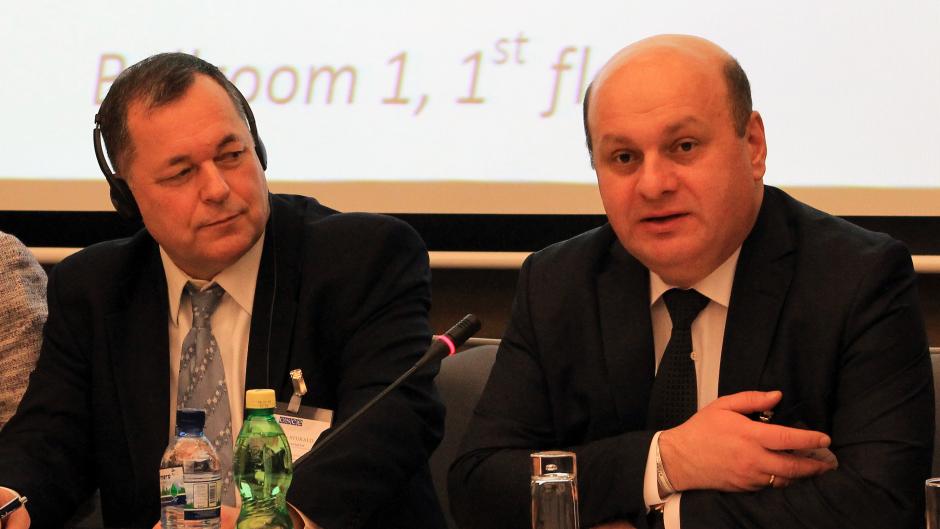 (L-r) Alexey Stukalo, Deputy Co-ordinator of OSCE Economic and Environmental Activities, and Nodar Khaduri, Minister of Finance of Georgia during an OSCE-led regional seminar on effective measures in preventing corruption, Batumi, 16 December 2014.