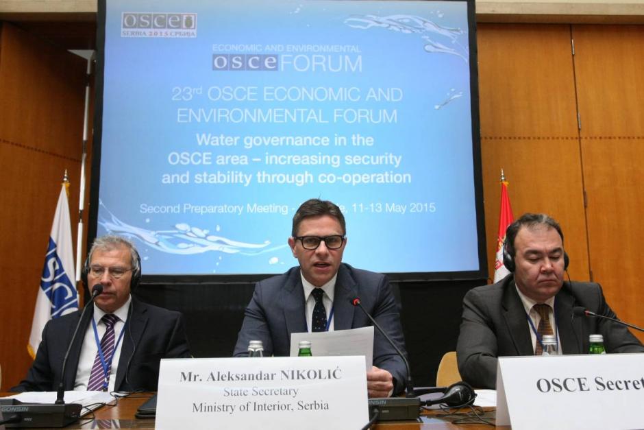 Serbia's State Secretary of the Interior Ministry Aleksandar Nikolić (c) speaking during the Second Preparatory Meeting of the 23rd OSCE Economic and Environmental Forum, Belgrade, 12 May 2015.