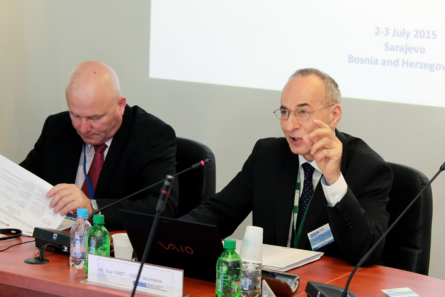 Guy Vinet (r), Head of Strategic Police Matters Unit at the OSCE, addressing attendees at the workshop on law enforcement co-operation in combating the increasing spread of new psychoactive substances, Sarajevo, 2 Jul 2015.