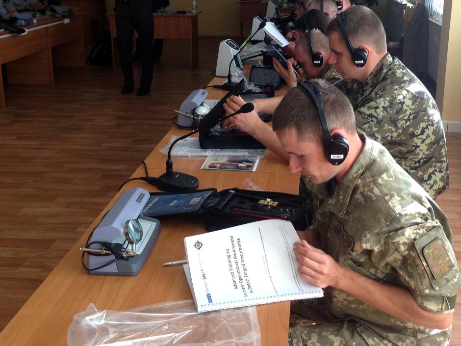 Ukrainian border control officers in training course on practical abilities to detect forged travel documents, Cherasy, 7 September 2015.