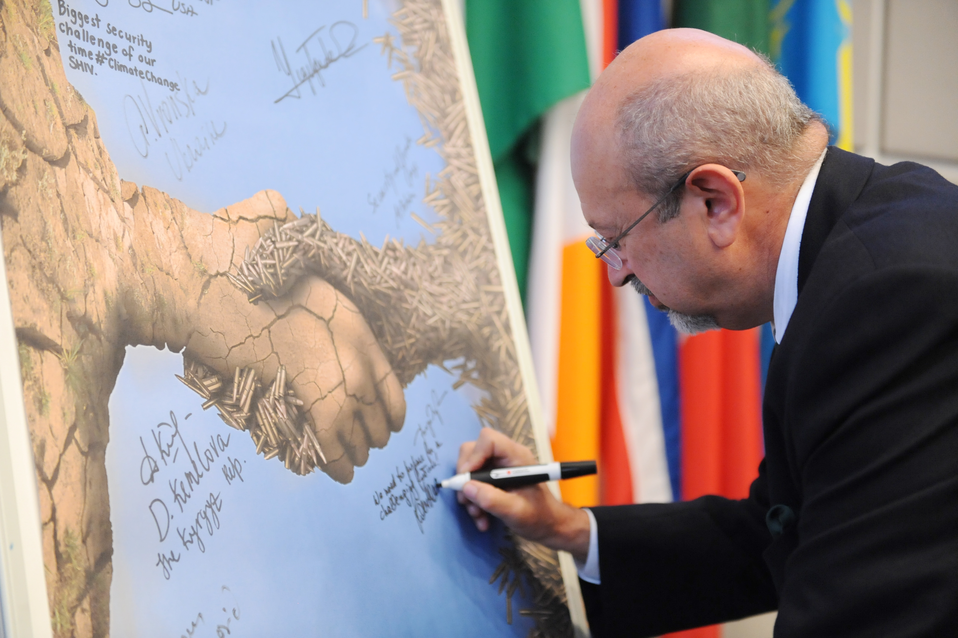 OSCE Secretary General Lamberto Zannier signing the poster with the winning design of the joint OSCE-eYeka crowdsourcing competition on security and climate change, during the OSCE Security Days event on climate change and security, Vienna, 28 October 2015.