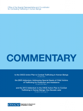 The Commentary to the OSCE Action Plan to Combat Trafficking in Human Beings (PC.DEC/557), the 2005 Addendum Addressing Special Needs of Child Victims of Trafficking for Protection and Assistance (PC.DEC/557/Rev.1) and the 2013 Addendum to the OSCE Action Plan to Combat Trafficking in Human Beings: One Decade Later (PC.DEC/1107/Corr.11) is designed to clarify the most challenging issues addressed by the OSCE anti-trafficking commitments and recommendations and to continue to help in the Action Plan’s implementation by all stakeholders. The Commentary has the goal to provide technical assistance to the participating States, in line with the SR/CTHB’s mandate. It also is to serve as a useful, and much needed, reminder of the so-called “agreed OSCE language”, language that clearly demonstrates basic human rights principles and internationally agreed human rights norms and terminology.