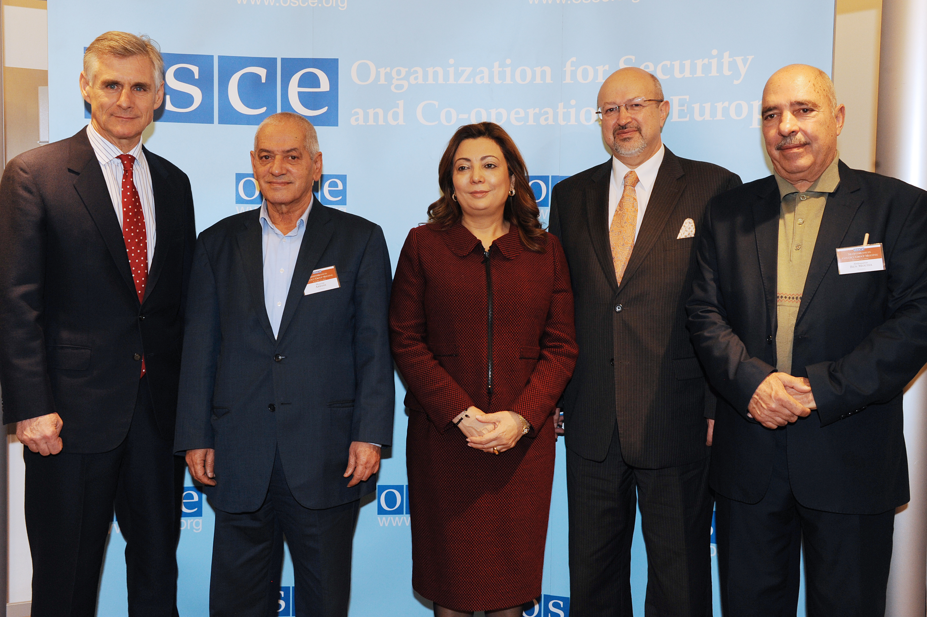 OSCE Secretary General Lamberto Zannier (second right) along the Austrian Deputy Foreign Minister Michael Linhart (left), and the representatives of the Tunisian National Dialogue Quartet Houcine Abassi (second left), Ouided Bouchamaoui (center) and Abdelssatar Ben Moussa (right), during an OSCE Mediterranean Contact Group meeting, Vienna, 29 February 2016.