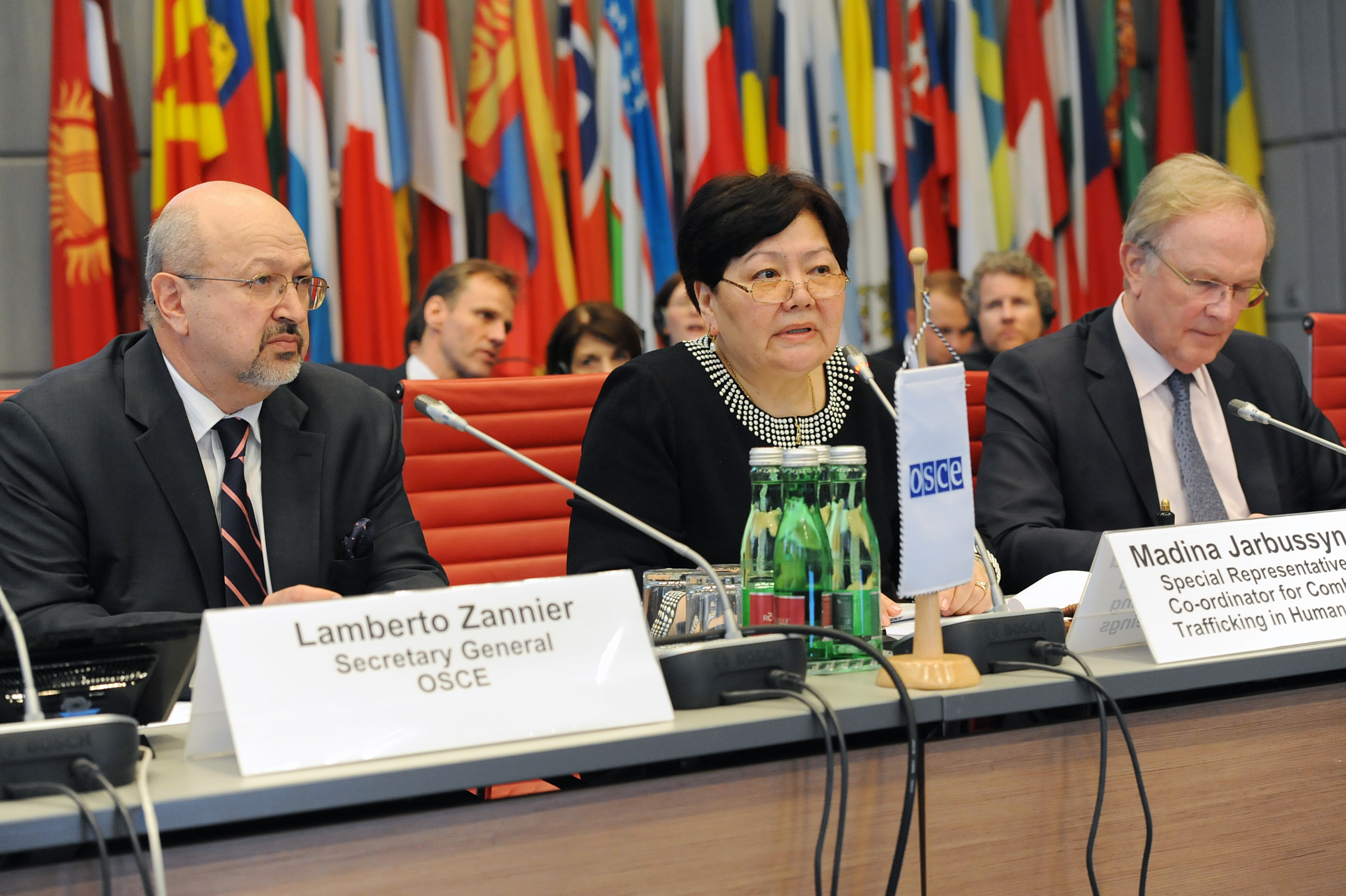 Secretary General Lamberto Zannier; Special representative and Co-Ordinator for Combating Trafficking in Human Beings, Madina Jarbussynova; and Permanent Representative of Germany to the OSCE, Ambassador Eberhard Pohl, Vienna, 11 April 2016.
