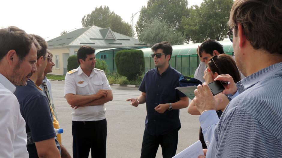 Participants during a workshop interact with officials at the Tursunzade border crossing-point between Tajikistan and Uzbekistan, 14 June 2016.