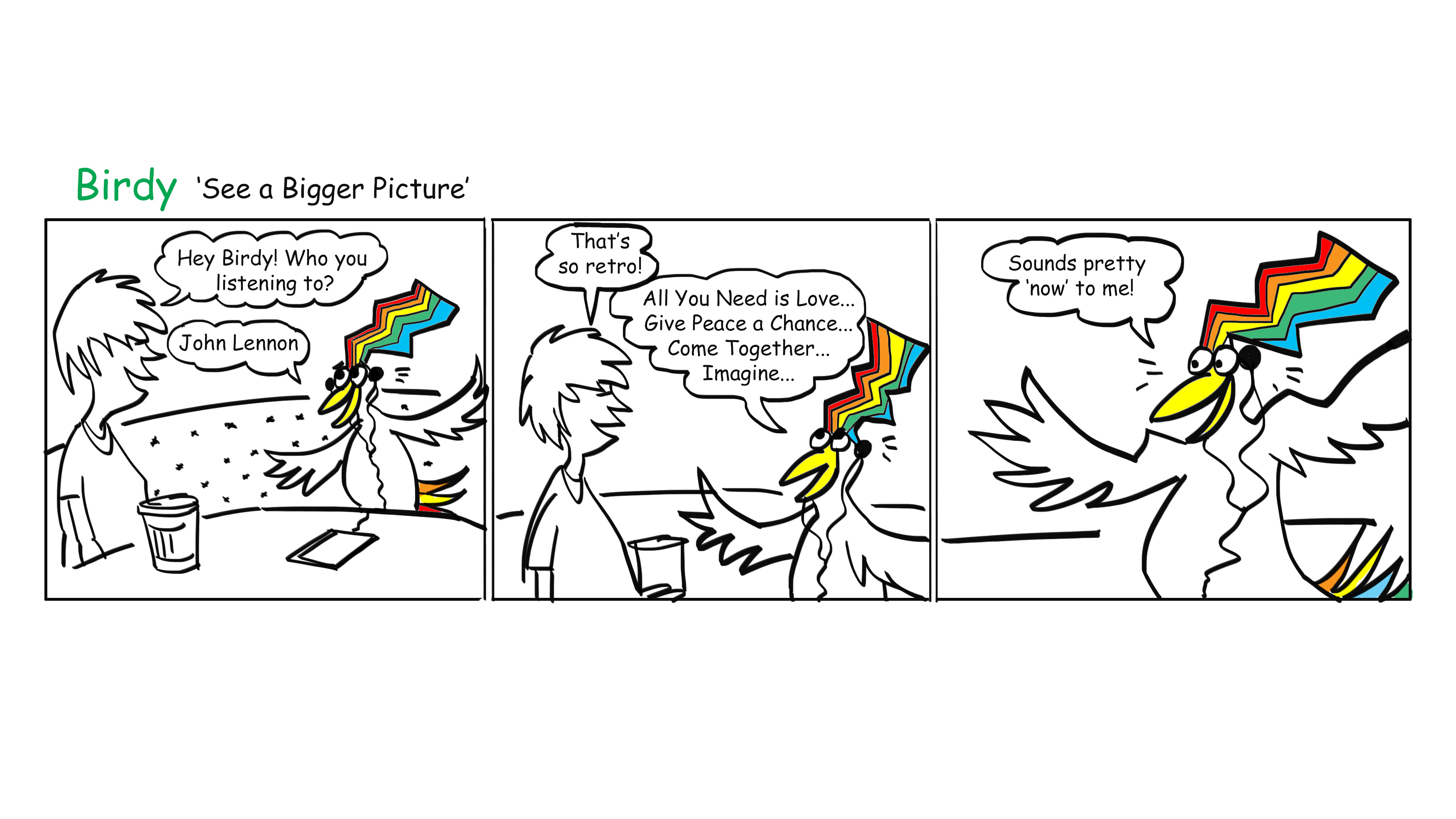 “He takes a bird’s-eye-view of violent extremism: well, he would do – he is a bird,” says Tim. Seeing the bigger picture helps Birdy see the world in a more sensible and nuanced way.