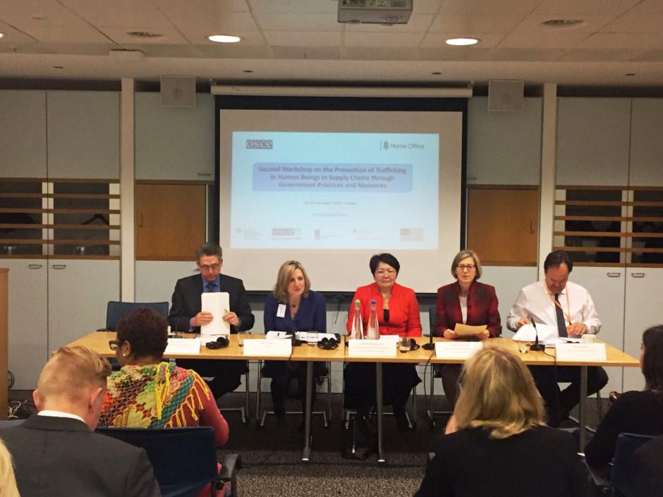 Exploring new ways of addressing modern slavery through government practices and measures: discussants Kevin Hyland, UK Independent Anti-Slavery Commissioner, Ruth Freedom Pojman and Ambassador Madina Jarbussynova, Office of the OSCE Special Representative and Co-ordinator for Combating Trafficking in Human Beings, Sarah Newton MP, Parliamentary Under Secretary of State for Vulnerability, Safeguarding and Countering Extremism and John Morrison, Chief Executive, Institute for Human Rights and Business.