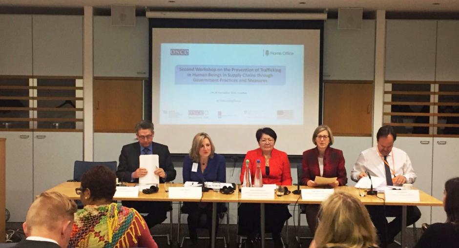 LONDON, United Kingdom, 29 November 2016 - Ambassador Madina Jarbussynova, OSCE Special Representative and Co-ordinator for Combating Trafficking and Sarah Newton, Minister for Vulnerability, Safeguarding and Countering Extremism of the government of the United Kingdom, opened today a workshop on preventing modern slavery in supply chains.
