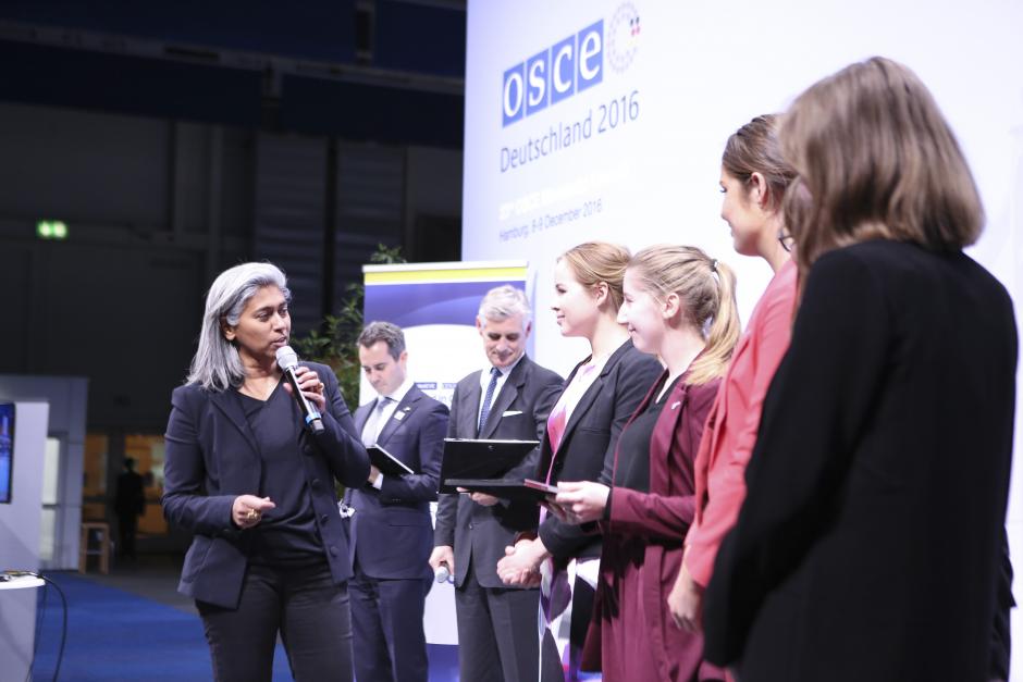Ambassador Veronique Roge-Lacan, Permanent Representative of France to the OSCE, awarding the team from Lund University, Hamburg, 8 December 2016.