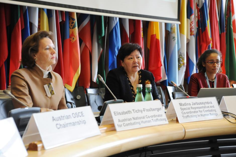 Ambassador Madina Jarbussynova, OSCE Special Representative and Co-ordinator for Combating Trafficking in Human Beings (c) speaking at an event on Preventing Human Trafficking for Domestic Servitude in Diplomatic Households, Vienna, 12 May 2017.