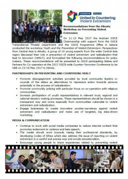On 11-13 May 2017, Austrian OSCE Chairmanship-in-Office brought together in Almaty a group of youth from the wider Central Asian region to discuss the prevention of violent extremism. This is a summary of the most important recommendations that the group identified from their experience, and will present to the OSCE participating States and Partners for Co-operation at the 2017 OSCE-wide Counter-Terrorism Conference to be held in Vienna on 23-24 May 2017.