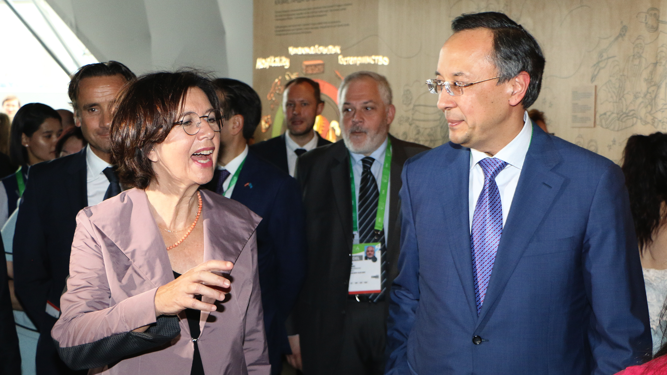 Christine Muttonen, President of OSCE Parliamentary Assembly, speaking to Minister of Foreign Affairs Kairat Abdrakhmanov, at the site of Astana EXPO-2017, 14 June 2017.