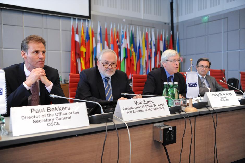 (l-r) Paul Bekkers, Director of the Office of the Secretary General, Vuk Žugić, Co-ordinator of OSCE Economic and Environmental Activities and Ambassador Christian Strohal, 2017 Austrian OSCE Chairmanship during the opening session of the Expert meeting on strengthening resilience of local communities to the presence of migrants, 4 July 2017, Hofburg, Vienna.