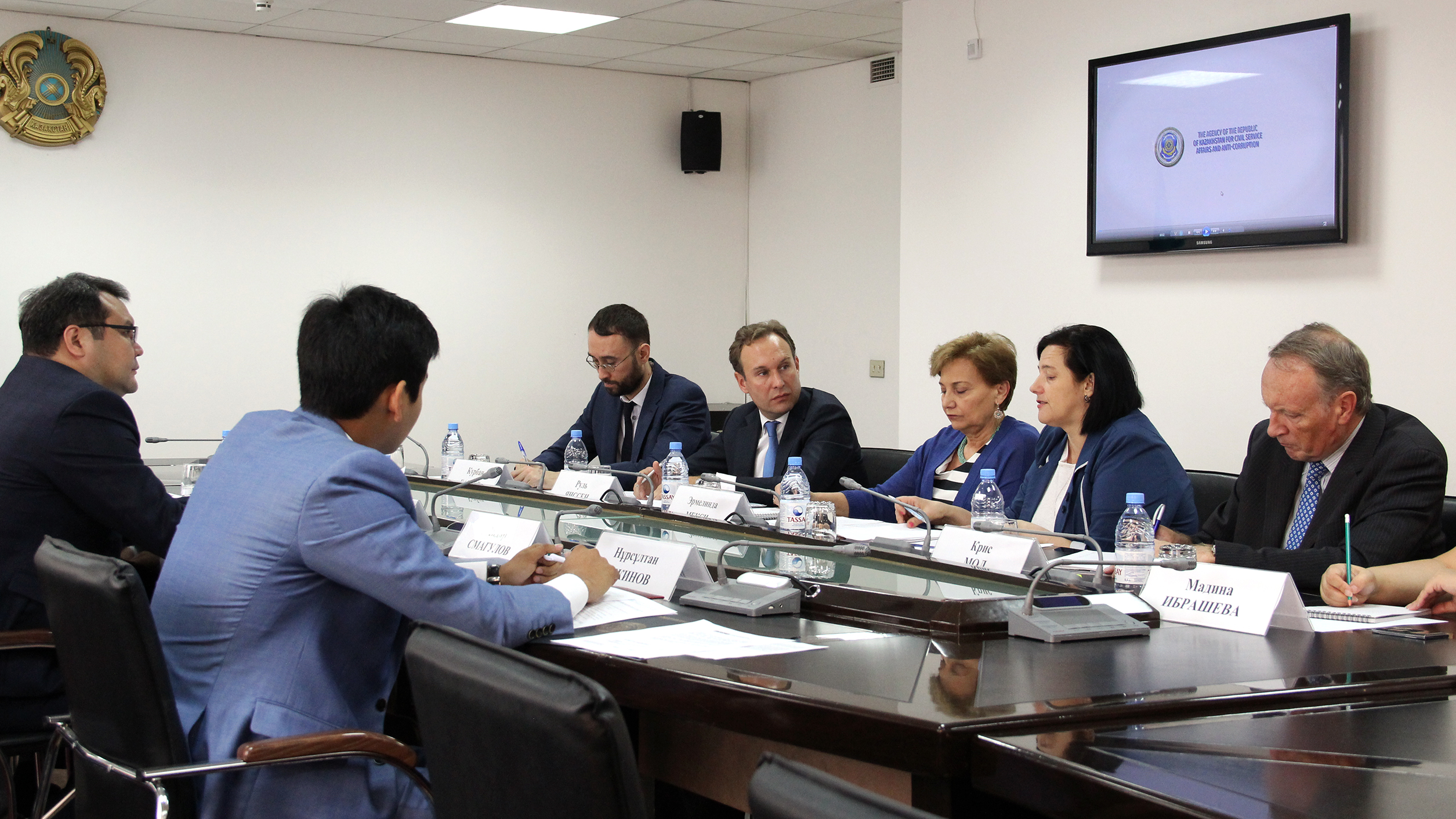 Representatives from the Office of the Co-ordinator of OSCE Economic and Environmental Activities and the OSCE Programme Office in Astana discussing anti-corruption efforts with government agencies from Kazakhstan, Astana, 11 July 2017.