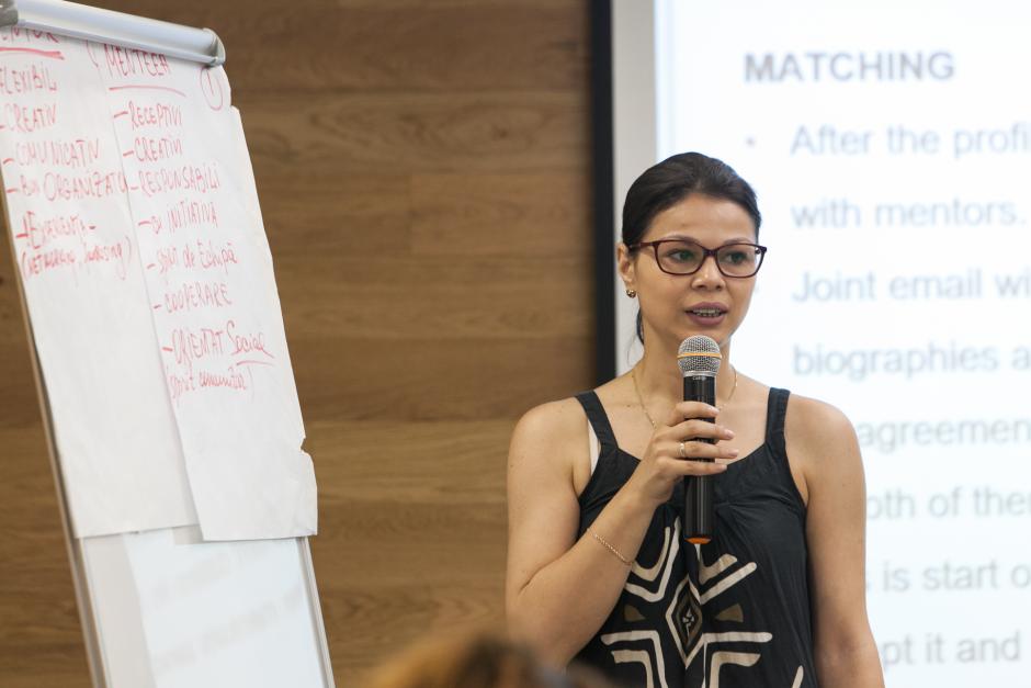 A participant presents her work during the training on establishing mentor networks for civil society organizations in Chisinau, 10-11 July 2017.