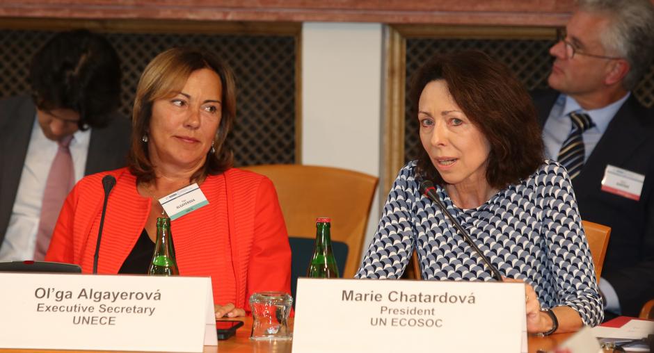 (l-r) Ol’ga Algayerová, Executive Secretary, United Nations Economic Commission for Europe (UNECE) and Marie Chatardová, President, UN Economic and Social Council (ECOSOC) delivering keynote speeches at the Concluding Meeting of the 25th OSCE Economic and Environmental Forum, Prague, 6 September 2017. (Ludek Pravda)