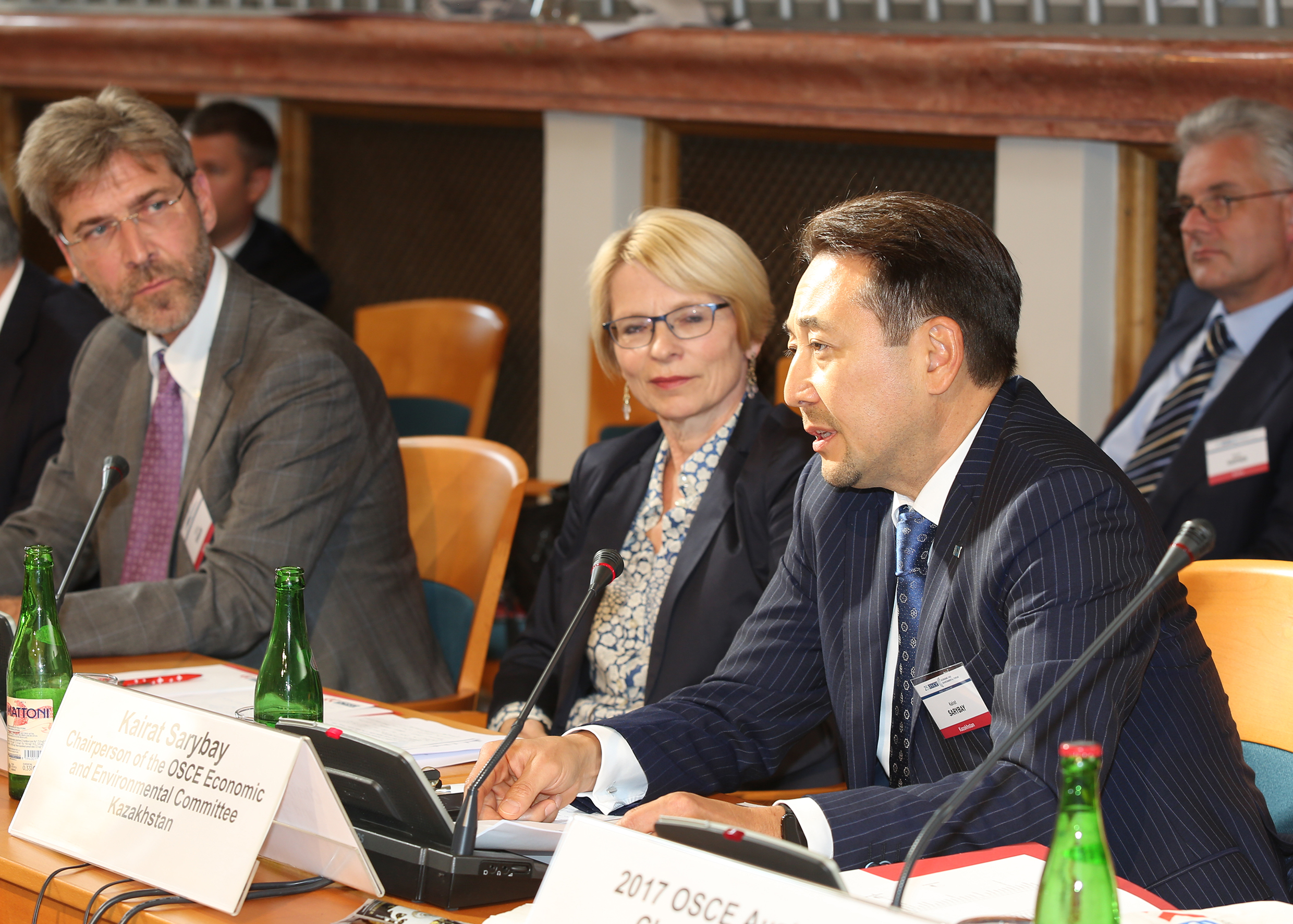 Ambassador Kairat Sarybay (r), Chairperson of the OSCE Economic and Environmental Committee, Permanent Representative of the Republic of Kazakhstan to the International Organizations in Vienna speaks at the Concluding Meeting of the 25th OSCE Economic and Environmental Forum, Prague, 6 September 2017.