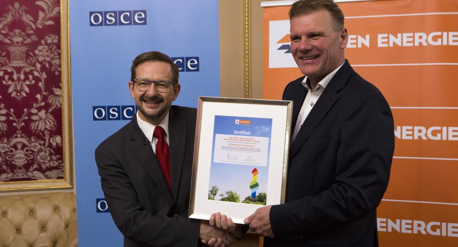 VIENNA, 11 October 2017 - The OSCE Secretariat in Vienna has recently started using electricity which is 100% derived from renewable energy sources. Wien Energie, the main energy supplier to the Austrian capital, is awarding today the OSCE with a certificate to mark this achievement.