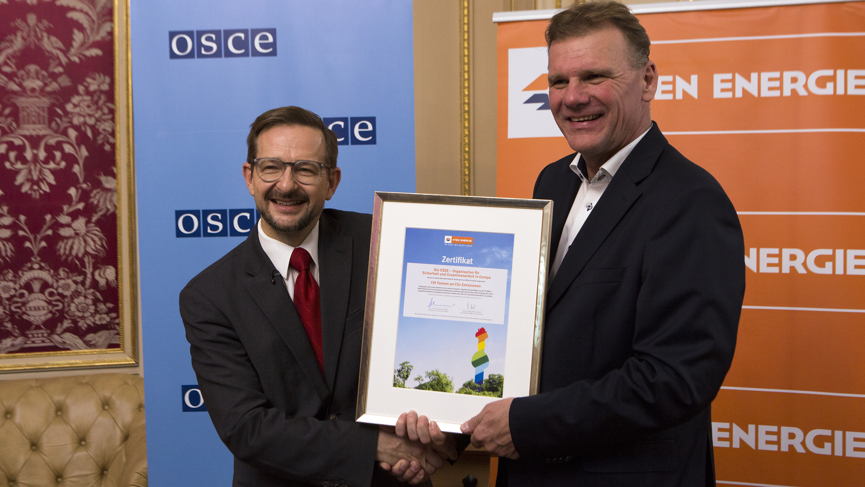 Thomas Greminger, OSCE Secretary General (l) receiving certificate from Michael Strebl, Wien Energie-CEO, Vienna, 11 October 2017.