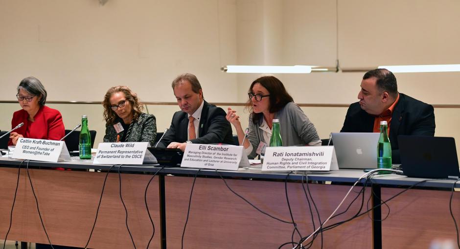 Elli Scambor (r), Managing director of the Institute for Masculinity Studies presenting in the panel discussion at the MenEngage expert meeting, Vienna, 24 November 2017.