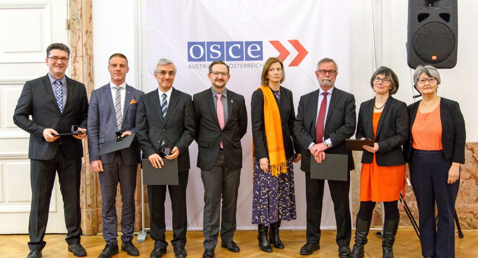 OSCE Secretary General Thomas Greminger presented Ambassador Natasha Cayer of Canada; Lieutenant Colonel Kim Willum Hansen Guldbech of Denmark; Ambassador Steffen Kongstad of Norway; Colonel Robert Kordik of Serbia; Ambassador Rauf Engin Soysal of Turkey and Ambassador Sian MacLeod of the United Kingdom with white ribbons awards.