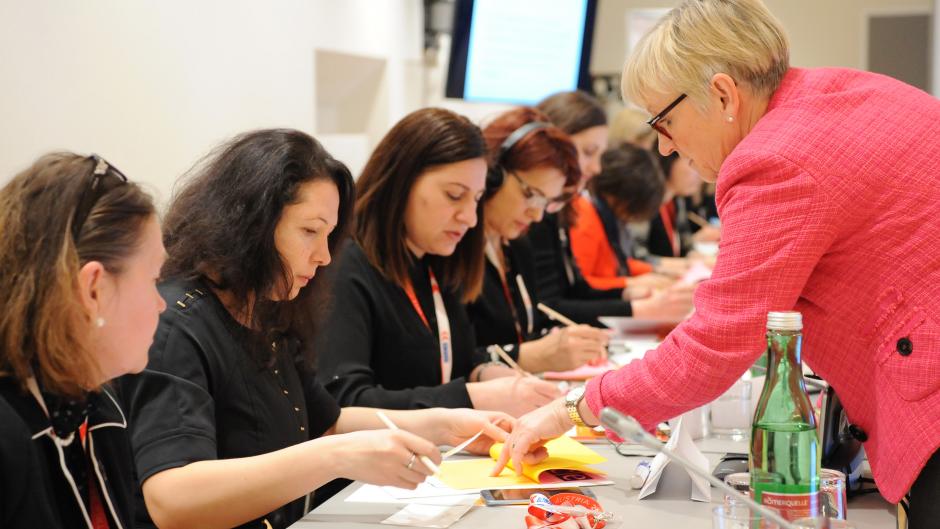 Christine Jantscher, Facilitator of the OSCE Mentor Networks Evaluation Seminar, explains an exercise to the group, Vienna, 29 January 2018.