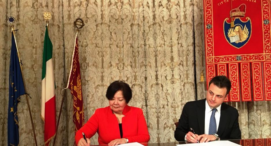 VENICE, 12 April 2018 - The Commissioner of the Municipality of Venice, Mr. Simone Venturini, and the OSCE Special Representative and Co-ordinator for Combating Trafficking in Human Beings, Madina Jarbussynova, signed an agreement today strengthening co-operation between the OSCE and the Municipality of Venice regarding victim protection and the fight against organized criminal networks involved in trafficking.