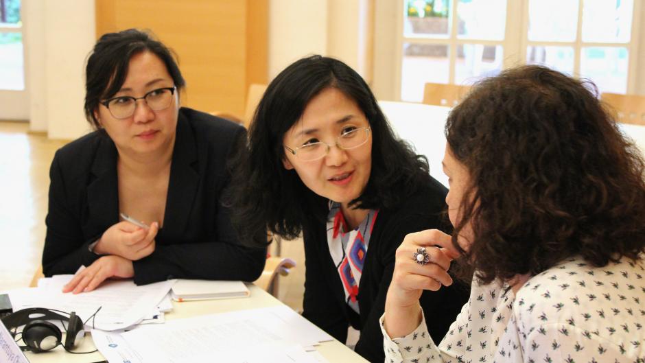 (L-r) Narantuya Dambakhavan, Senior Officer from the Ministry of Justice and Home Affairs of Mongolia, Burmaa Tsetsegdemberel, Officer from the Ministry of Defence of Mongolia, and Ayse Betul Chelik, Professor from Sabanci University in Istanbul, discussing how to build an enabling environment for the NAP in their countries, Vienna, 19 April 2018.