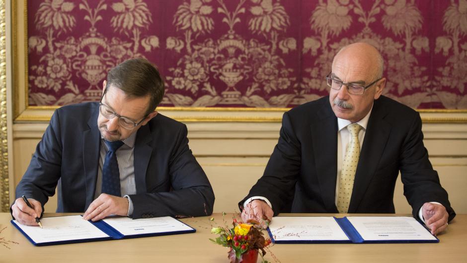 OSCE Secretary General Thomas Greminger (l) and Vladimir Voronkov, UN Under-Secretary-General and Head of the United Nations Counter-Terrorism Office (UNOCT), signing the Memorandum of Understanding, Vienna, 4 October 2018.