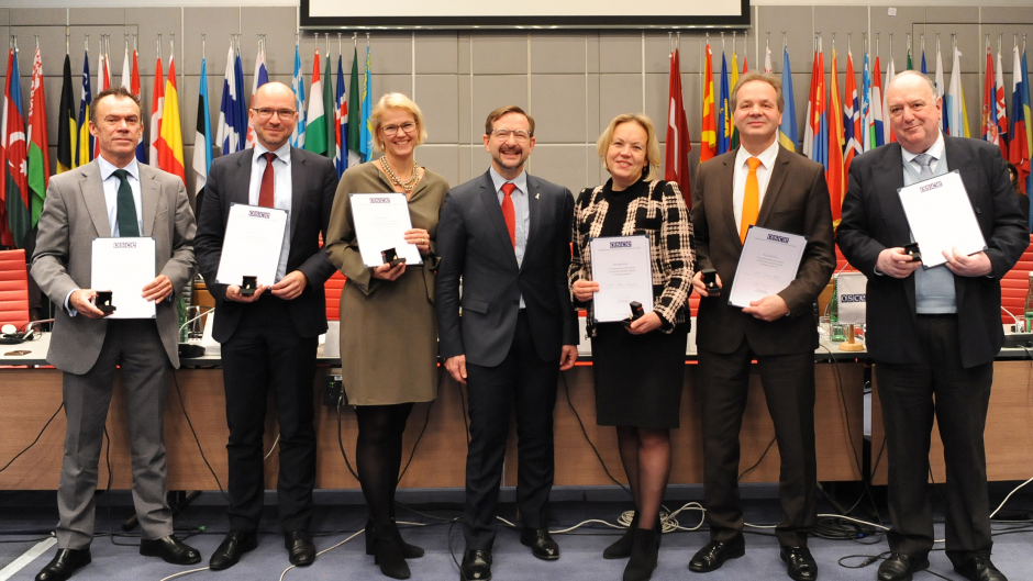 (L-r): Commander Graham Townsend of the United Kingdom; Jürgen Heissel of the Austrian Delegation; Ambassador Ulrika Funered of Sweden; OSCE Secretary General Thomas Greminger; Ambassador Alena Kupchyna of Belarus; Ambassador Claude Wilde of Switzerland; and Juan Armando Andrada-Vanderwilde, Deputy Permanent Representative of Spain during the White Ribbon Ceremony, Vienna, 22 November 2018.
