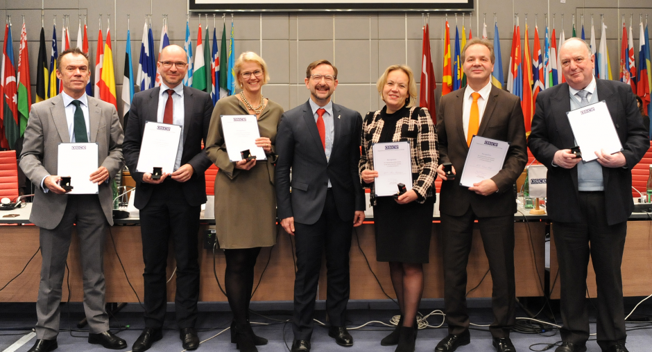 Secretary General Greminger awarded white ribbons to Ambassador Ulrika Funered of Sweden; Ambassador Alena Kupchyna of Belarus; Ambassador Victoria Gonzalez Román of Spain; Ambassador Claude Wilde of Switzerland; Jürgen Heissel of the Austrian Delegation and Commander Graham Townsend of the United Kingdom.