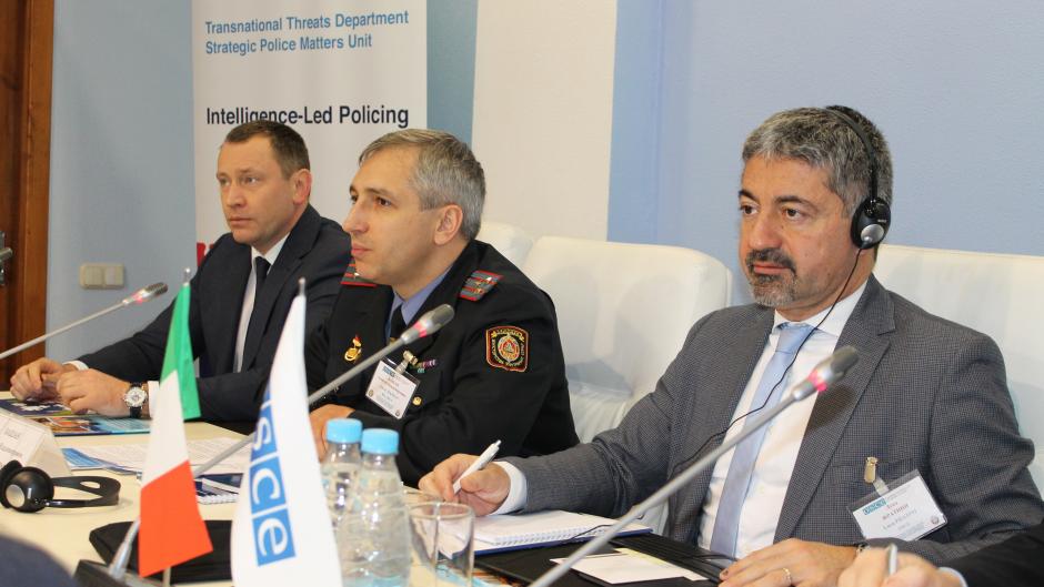 Ambassador Luca Fratini, Deputy Permanent Representative of Italy to the OSCE, Alexey Bashan, First Deputy Head of the Academy of the Ministry of Internal Affairs of Belarus and Maxim Svirid, Deputy Head of the Main Department for Crime Detection, Criminal Militia of Belarus at the OSCE Workshop dedicated to proactive and intelligence-led policing method in preventing serious and organized crime, Minsk, 13 December 2018.