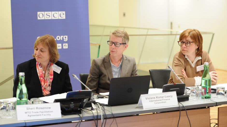 (l-r) Sheri Rosenow, World Trade Organization, Violane Konar-Leacy, International Finance Corporation, and Gordana Tosheva, USAID Skopje, during the Concluding Event on Promoting Economic Connectivity in the OSCE, Vienna, 26 March 2019.