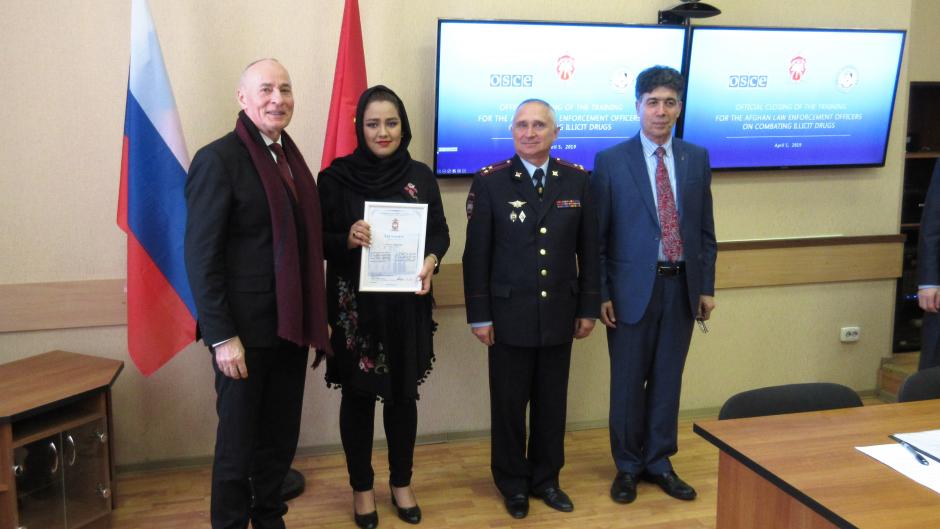 Guy Vinet (l), Head of the OSCE’s Strategic Police Matters Unit, presenting a certificate to a trainee from the Afghan National Police during a closing ceremony of an OSCE-organized training course focusing on combating illicit drug trafficking and drug-related crimes, Saint Petersburg, 5 April 2019.